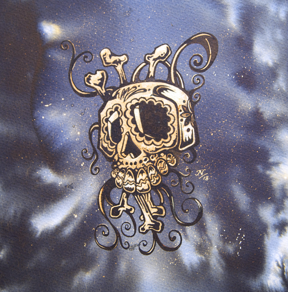 Quink black freeform blend onto 300gsm Saunders watercolour paper with bleach and quink detailing.