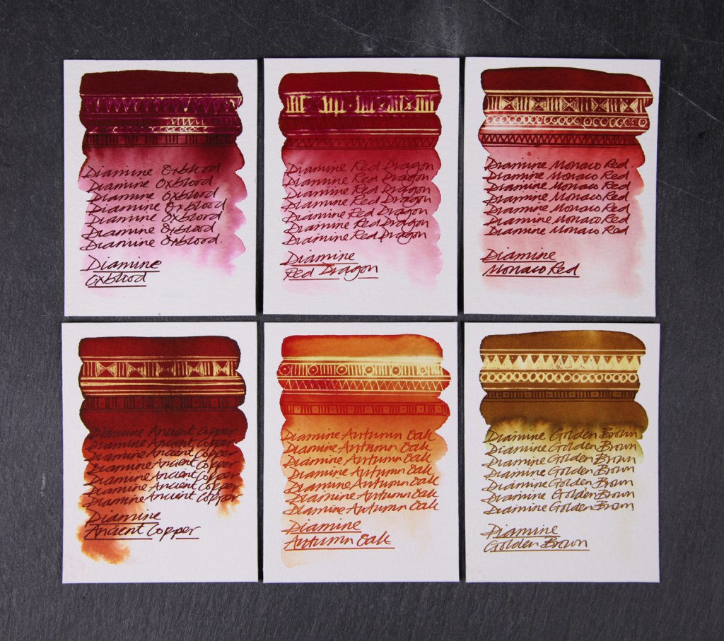 Diamine Red Dragon – Very similar qualities to the Oxblood. A thick dark rich ink that bleeds easily when added to water and behaves like a watercolour paint. Only reacts with bleach where the colour has been thinned by water. A deep rich red with a slightly yellower hue than the Oxblood when used for writing.