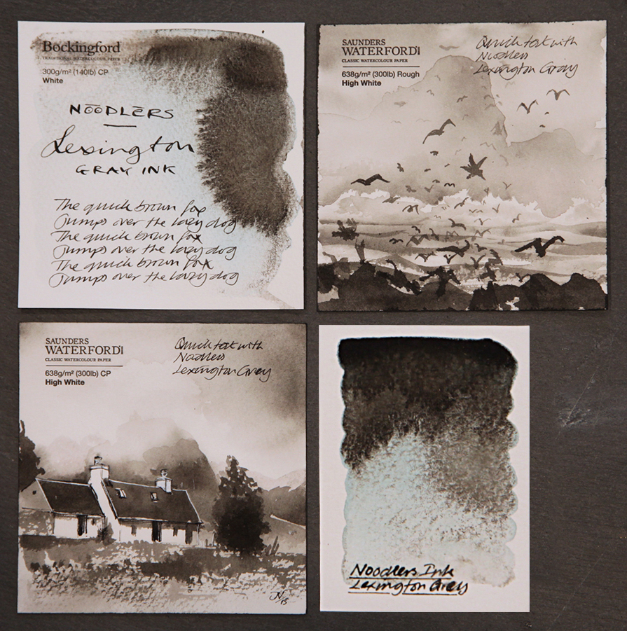 Lexington Gray is the strangest writing ink I have come across to-date. It behaves like a black watercolour paint with a beautiful subtle transparent blue that reveals itself when washed with water and used on watercolour paper. Now, the interesting thing is this, when used on a Bockingford watercolour paper you get a lovely cool grey and when used on a Saunders watercolour paper you get a warm grey!
