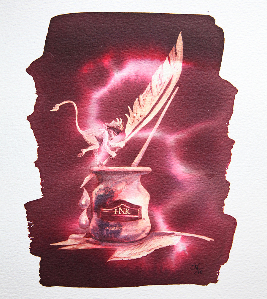 Just had to share this with you before the day job kicks in again tomorrow. This is de Atramentis Ebony! It bleeds blood red! No photoshop – this is absolutely what happens when washed with water! It literally bleeds! Make of it what you will but it’s a stunning ink to work into with bleach. This is the Ink Thief, a playful take on the de Atramentis logo. All good fun! And to recap – this is ink and bleach only, NO white paint and NO photoshop. This is the REAL joy of fountain pen inks. You can’t do this with any other art medium!