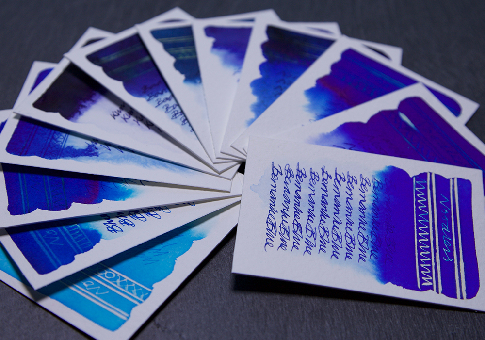 Inks tested: Kung Te Cheng, Bad Belted Kingfisher, O’Ternity, Polar Blue, Navy, Blue Eel, Blue, Bernanke Blue, Luxury Blue, Turquoise Eel, Bluerase Waterase, Lightning Blue