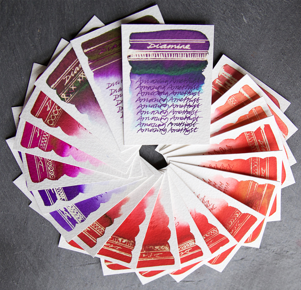 All of these inks are lovely – they blend well, react with a neon gold to bleach and flow easily through a nib for great writing. But for me, the stand outs are Bourgainvillea, Burgundy Rose, Crimson, Handel, Pansy and ‘top of the pops’ – Amazing Amethyst (it’s got everything!) – I’ll sort out some test art soon. If you’re into those subtleties then the first 12 bright reds demonstrate this perfectly. For the sheen freaks – Maroon, Wild Strawberry, Amazing Amethyst and Flamingo Pink are all worth looking at but for the a really great sheen, Pansy is my top pick – just look at that gorgeous metallic green.