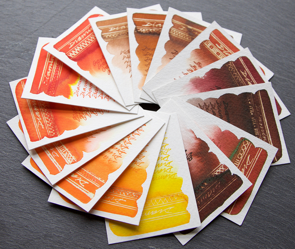 Inks tested: Macassar, Bach, Mozart, Strauss, Burnt Sienna, Dark Brown, Ochre, Warm Brown, Gerbera, Pumpkin, Blaze Orange, Peach Haze, Orange, Marigold and Yellow.