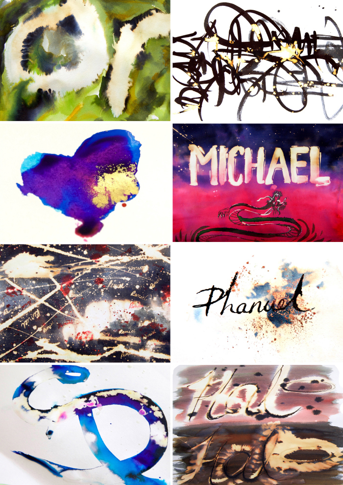 Calligraffiti is about abstracting calligraphy, type and graffiti with traditional precision and modern unbridled self-expression. Working with adults and sixth form students from Medway (non of whom have had any type or calligraphy experience) we have tried to push the boundaries of calligraffiti a little further. Taking inspiration from angelic names and ethereal words we have explored the possibilities of abstracting both the traditional tools and ink mediums in a ground breaking workshop utilising custom made pens and brushes with 10 Diamine inks (Oxblood, Sunshine Yellow, Denim, Apple Glory, Teal, Scarlet, Turquoise, Hope Pink, Majestic Purple and Jade Green), Quink black ink, bleach and Schmincke metal dusts – copper, silver and gold.