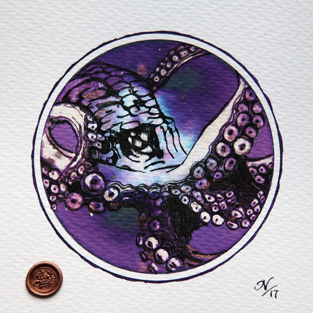 Just before I crack on with the Private Reserve tests I thought I’d post this – a little fun test art featuring the Kraken using my new pet favourite fountain pen ink Diamine Amazing Amethyst – and it really is amazing! Reacts beautifully with bleach; has a great tonal range; chromatically breaks down into pinks and cyan blues; AND, you even get a green sheen with the deal. Add this to the fact that Diamine Amazing Amethyst mixes readily with Schmincke copper dust too… and you really have got a lot of bang for your buck. See what you think!