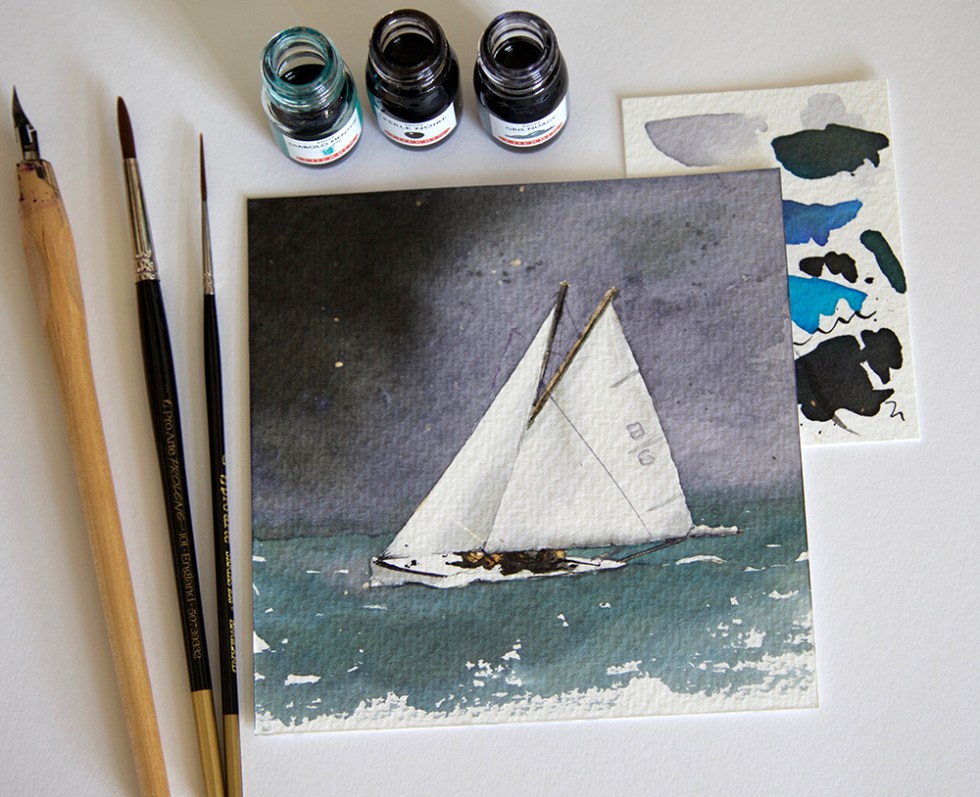 And this is the end result and I’m very happy with it. Using them like watercolours, they mix beautifully. Their delicate and thin make up are in fact a strength. For those of you who like sketching, painting and journalling here you go. All you need do is pack these 3 tiny little 10ml bottles and you’re sorted. The bleach of course also played a part in the outcome. When painted on top of the Perle Noir I got a wood colour. And of course, any errors on the sails or highlights needed, I just bleached away. So there you have it. J Herbin don’t just do shimmer inks. Their fountain pen inks are worth investigating further. Don’t just take my word for it, check them out!