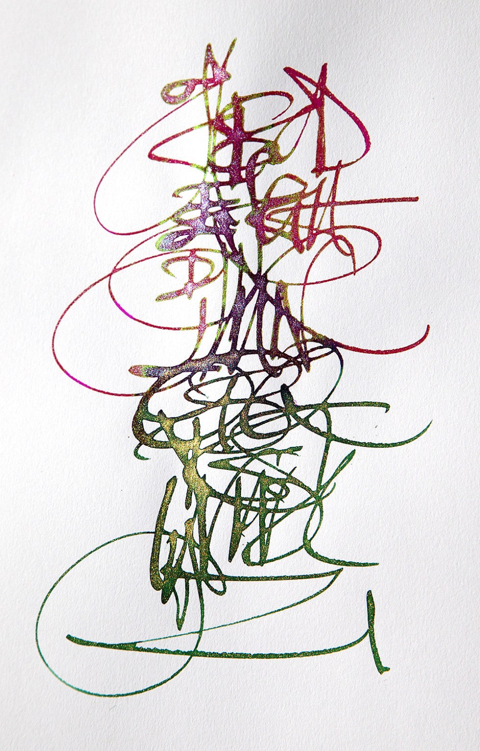 So let’s set the scene – I was quite scathing of these in my last review and although the bleeding issue has been resolved and the metals now flow more evenly, the dust is still very unstable when dry and the colours……! I said this before and I’ll say it again, De Atramentis are damn good ink manufacturers and have a substantial stable of gorgeous colours, but these are so dull! The pictures posted have been enhanced a little for the benefit of viewing the sheens and metals so don’t get too excited. Okay, when I blended them together in the abstract calligraphy test the two colours did create an interesting metallic sheen, but as said, I’ve had to really enhance the image for you to see this. There’s no shying away from this, these are dull colours and three metal versions of each dull colour just doesn’t win me over – at all. So, the majority of problems have been fixed, but with no vivid colours and no chromatic behaviours, what can I do with them?