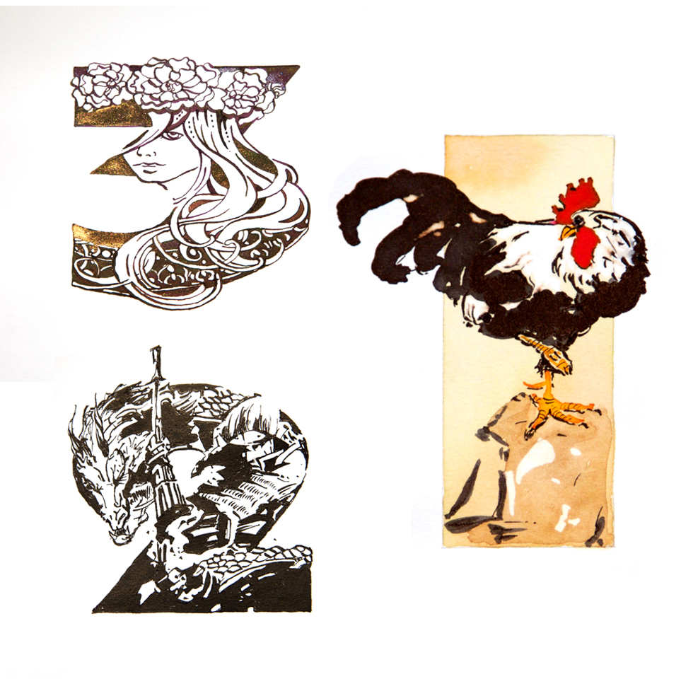 2. Samurai – This was a last bit of fun before the final piece. A Samurai warrior about to slay a dragon of some description. I used Hero black, brush and dip pen with flex nib.