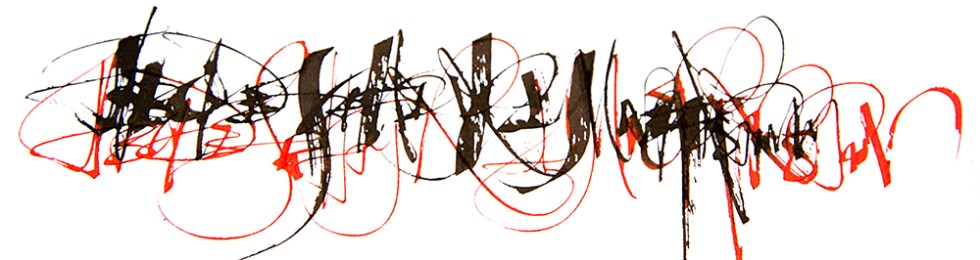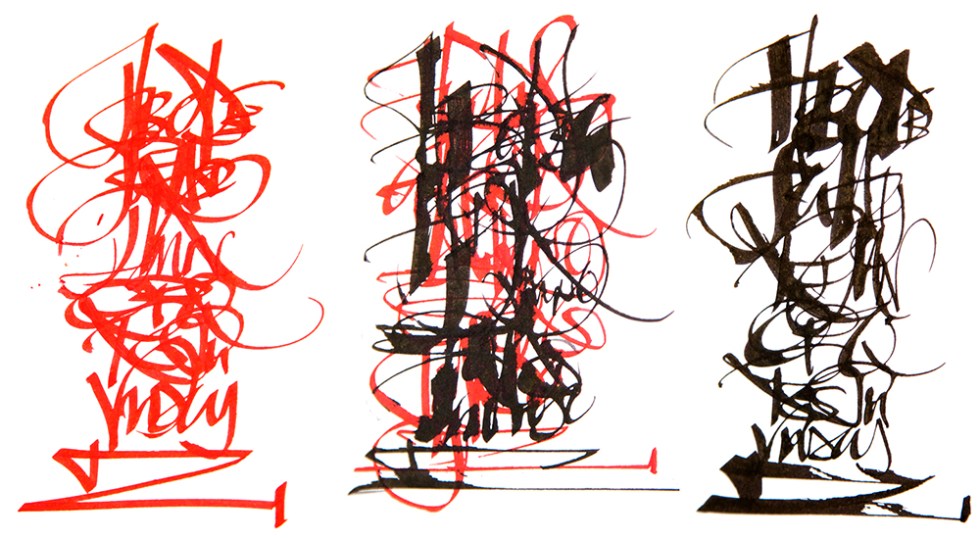 I loaded up both pens, one with a red cartridge, the other with black cartridge and set about my testing. I immediately noted that these nibs are sharp which is ideal, as I like creating abstract lettering – the visual dynamic between the fat strokes and the hairline strokes is crucial for the visual effect. BUT, and this is a big BUT, the ink flow in the Pilot Parallel is slow and dry! For freeform lettering this is a killer blow. You will have to work slowly and use a very smooth paper to get any depth of colour using a Pilot Parallel! The red and black abstract alphabets are on smooth cartridge using the supplied inks – quite scratchy marks.