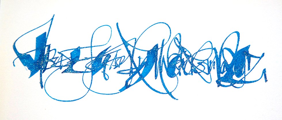 How could I improve the ink flow? I looked at the ink colour range provided and wondered if any other brands would work? I cleaned out both pens – which takes time – and eventually syringed some Diamine Shimmer colours into the cartridges. With some gentle persuasion, the pens worked much better. Even so, you’ll be lucky to experience any dramatic sheening as the ink flow is still a little on the dry side. The blue and pink abstract alphabets are on smooth cartridge using Diamine Shimmer inks – a smoother ink flow. Not as scratchy.