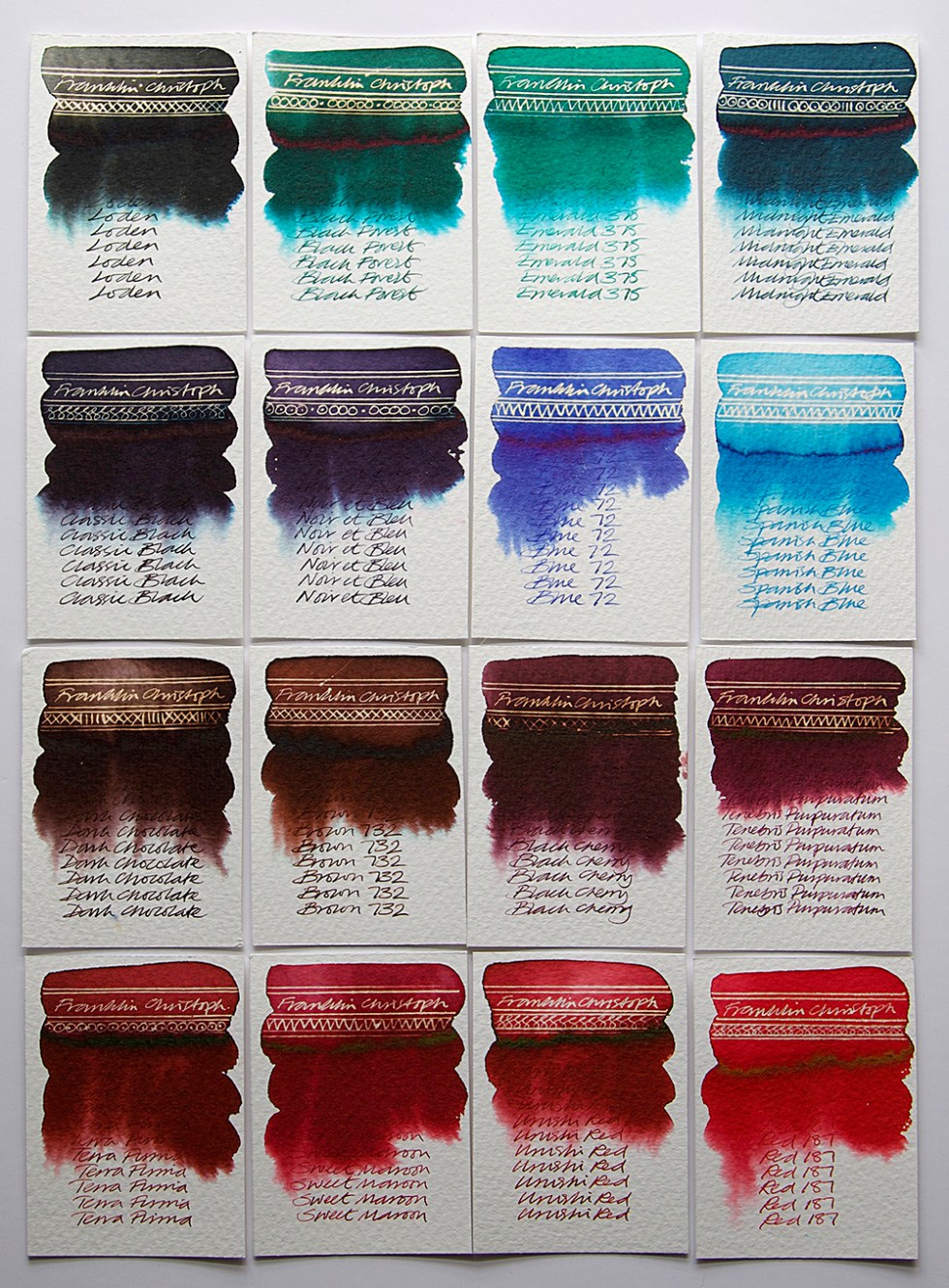 Inks swatch tested: Loden, Black Forest, Emerald 375, Midnight Emerald, Classic Black, Noir et Bleu, Blue 72, Spanish Blue, Dark Chocolate, Brown 732, Black Cherry, Tenebris Purpuratum, Terra Forma, Sweet Maroon, Urushi Red and Red 187.