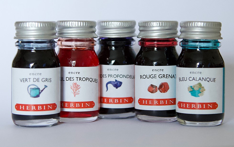 Anja from papierundstift.de has very kindly sent me the 5 new Herbin colours, not available in UK as yet. Please note that the ‘J’ is no longer there! It’s HERBIN. And what is immediately comforting is that these are most definitely from the Herbin family. That classic dull matte appearance with micro subtle chromatography is all part of that classic Herbin heritage. I’m actually very fond of this brand – great inks to paint with – and they have a vintage retro feel about them. Click for previous reviews.