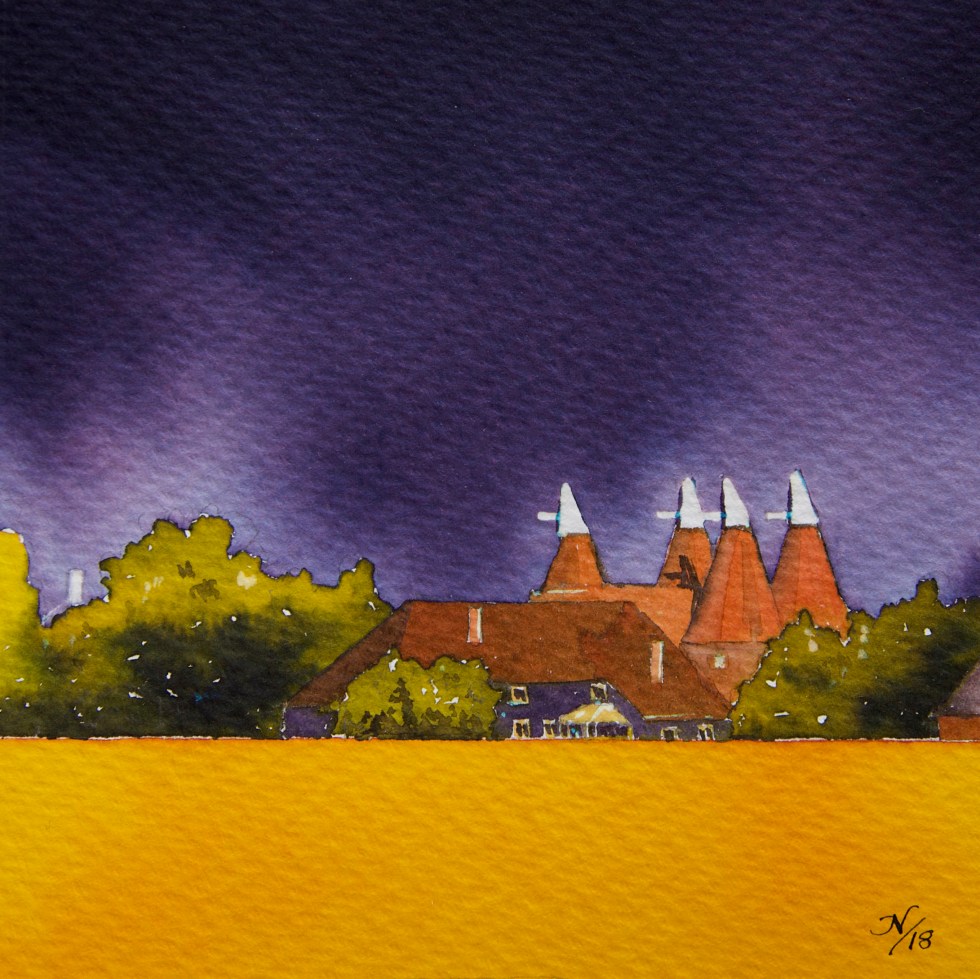 The image I submitted is a typical summer scene in the Weald of Kent which is where I cycle a lot of the time. Using three Robert Oster Signature inks – Yellow Sunrise, Blue Black and Terracotta I wanted to illustrate the unique heritage architecture of Kent – the oast houses and black wooden panelled barns. The dense cloud cover highlighted the intense yellow of the rape seed growing in the fields and the terracotta of the tiles and bricks. The limited palette helped keep the artwork fresh and alive. The greens were created by mixing the yellow and blue black together, seamlessly linking the land and sky together. The darker tones by overlaying washes of blue black. Highlights were created with bleach. This was quick to do – 25 mins start to finish. One of the beauty’s of fountain pen inks is that they dry quickly allowing speedy work!