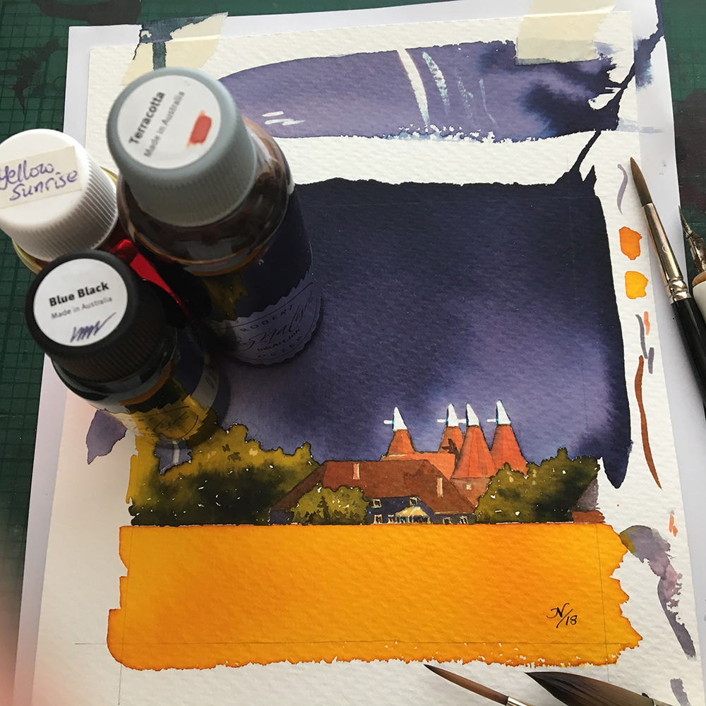 The image I submitted is a typical summer scene in the Weald of Kent which is where I cycle a lot of the time. Using three Robert Oster Signature inks – Yellow Sunrise, Blue Black and Terracotta I wanted to illustrate the unique heritage architecture of Kent – the oast houses and black wooden panelled barns. The dense cloud cover highlighted the intense yellow of the rape seed growing in the fields and the terracotta of the tiles and bricks. The limited palette helped keep the artwork fresh and alive. The greens were created by mixing the yellow and blue black together, seamlessly linking the land and sky together. The darker tones by overlaying washes of blue black. Highlights were created with bleach. This was quick to do – 25 mins start to finish. One of the beauty’s of fountain pen inks is that they dry quickly allowing speedy work!