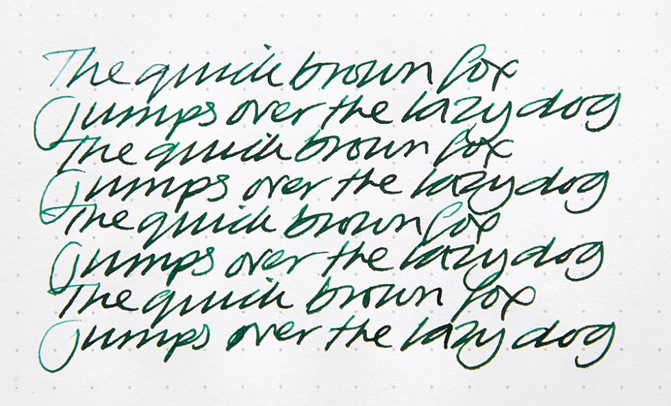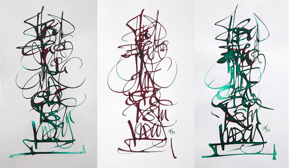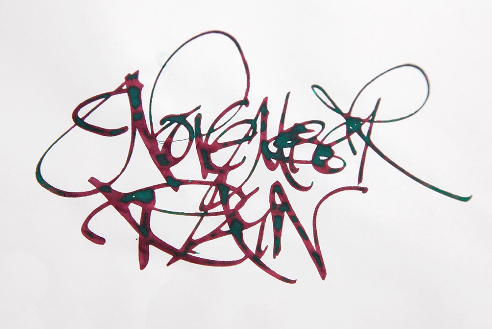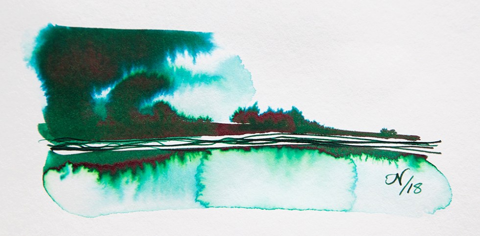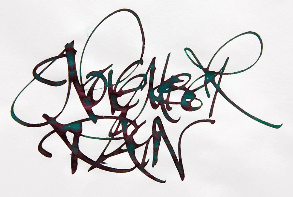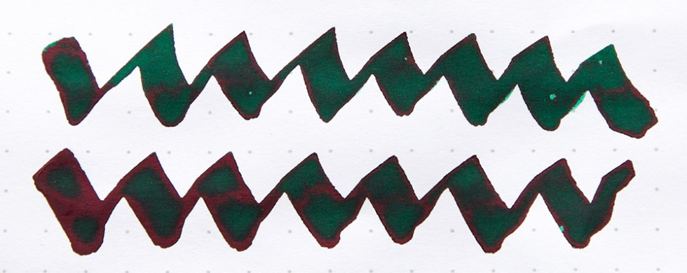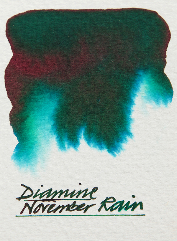Diamine are about to produce another German exclusive – November Rain. A deep almost holly green with blues and lime greens when washed with water and a shiny rusty crimson coloured sheen when viewed at an angle in bright light.