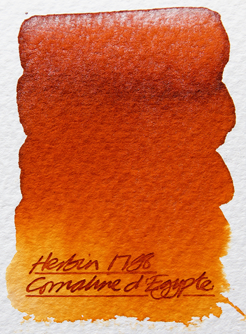 Adam Whittaker from Exaclair has very kindly sent me a sample of the new metallic ink from Herbin to test – Cornaline d’Egypt – part of a new range I assume, of 1798. Now whether or not this is as good as some of the recent Diamine Shimmer inks is up to you to decide? The colour is vivid and certainly reminiscent of Noodler’s Apache Sunset.