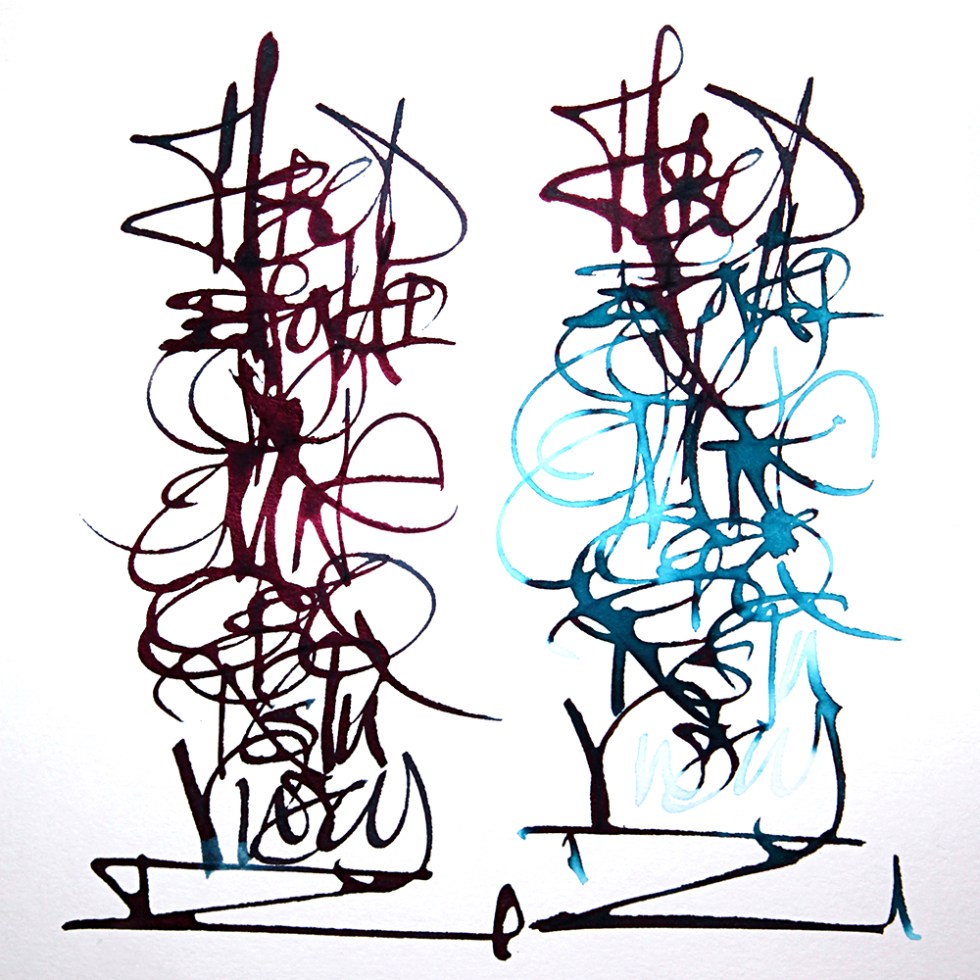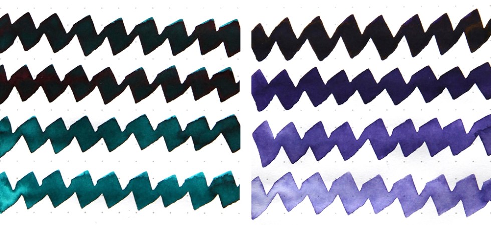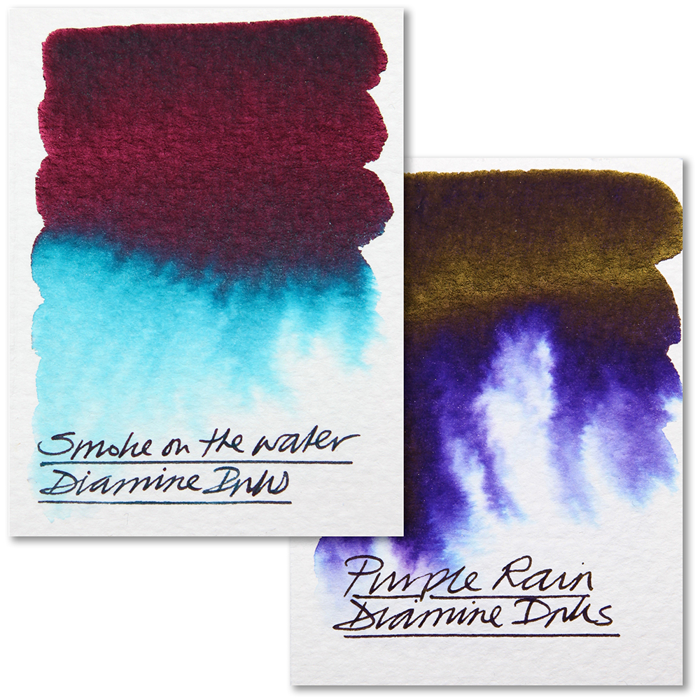 Diamine Smoke on the Water and Purple Rain. Another extreme sheen German exclusive. Deep rich coloured inks with fabulous blue green and purple chromatography and gorgeous deep metallic pink and yellow gold sheens.