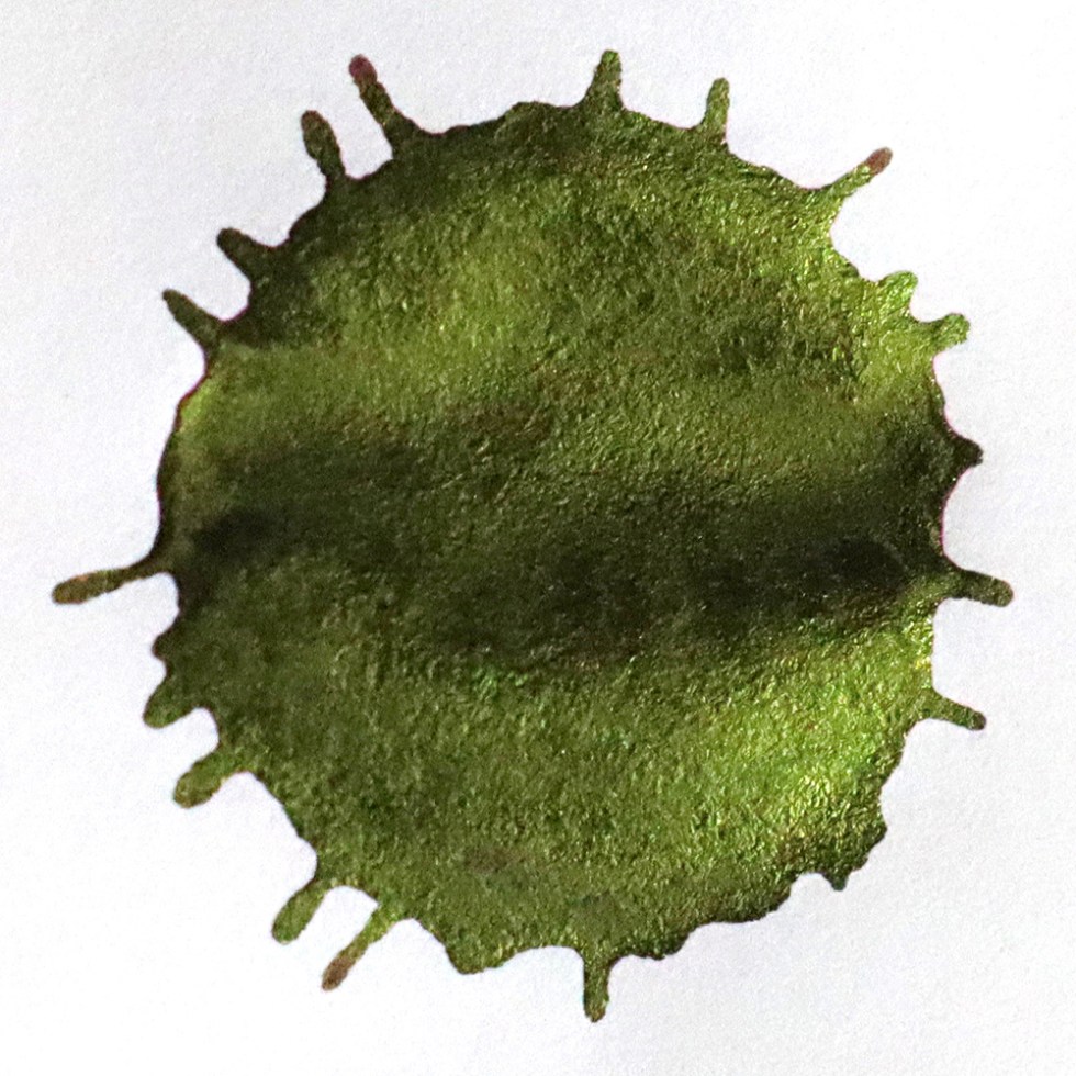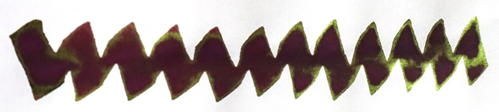 When dry, the concentrated areas dry a metallic green. Depending on your paper surface the ink writes as a very very very deep dark purple with hints of metallic green sheen in evidence.