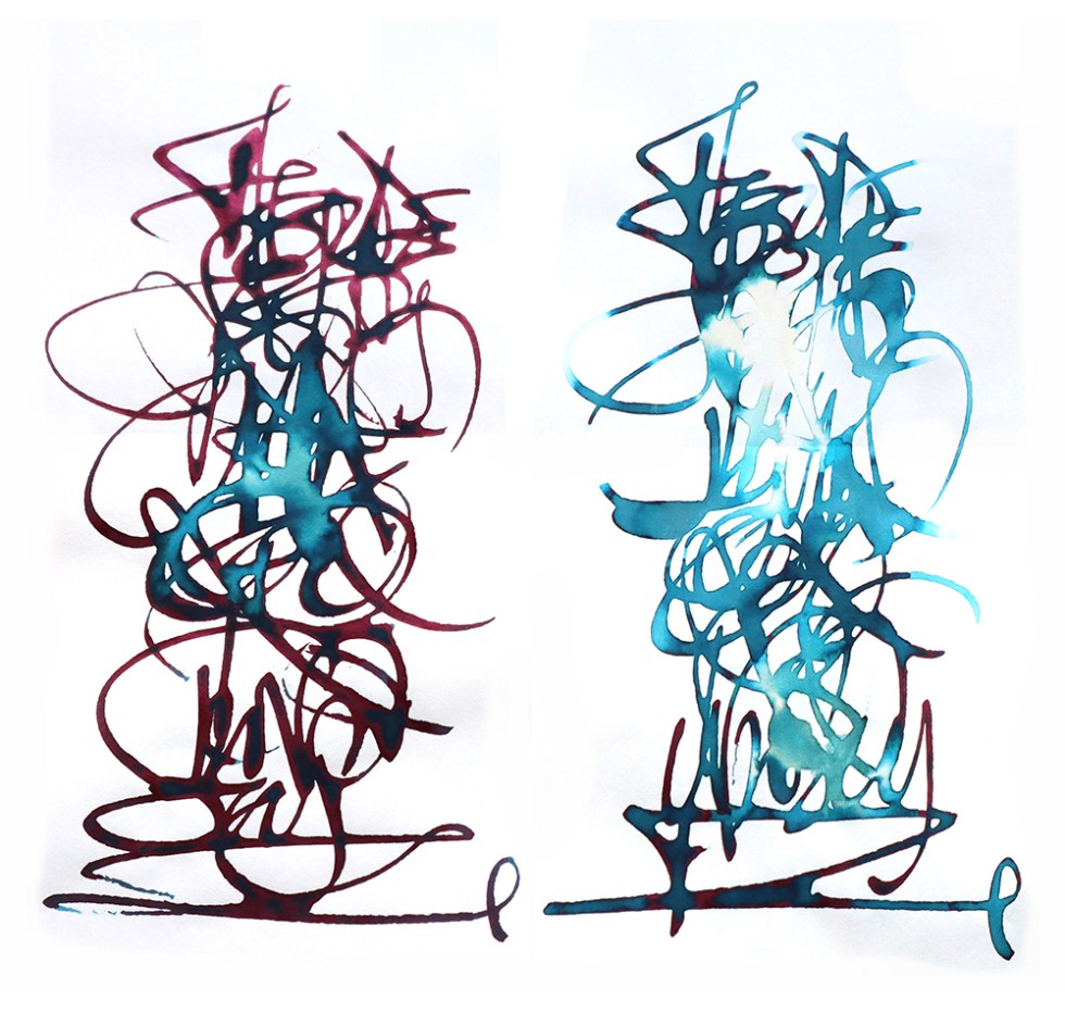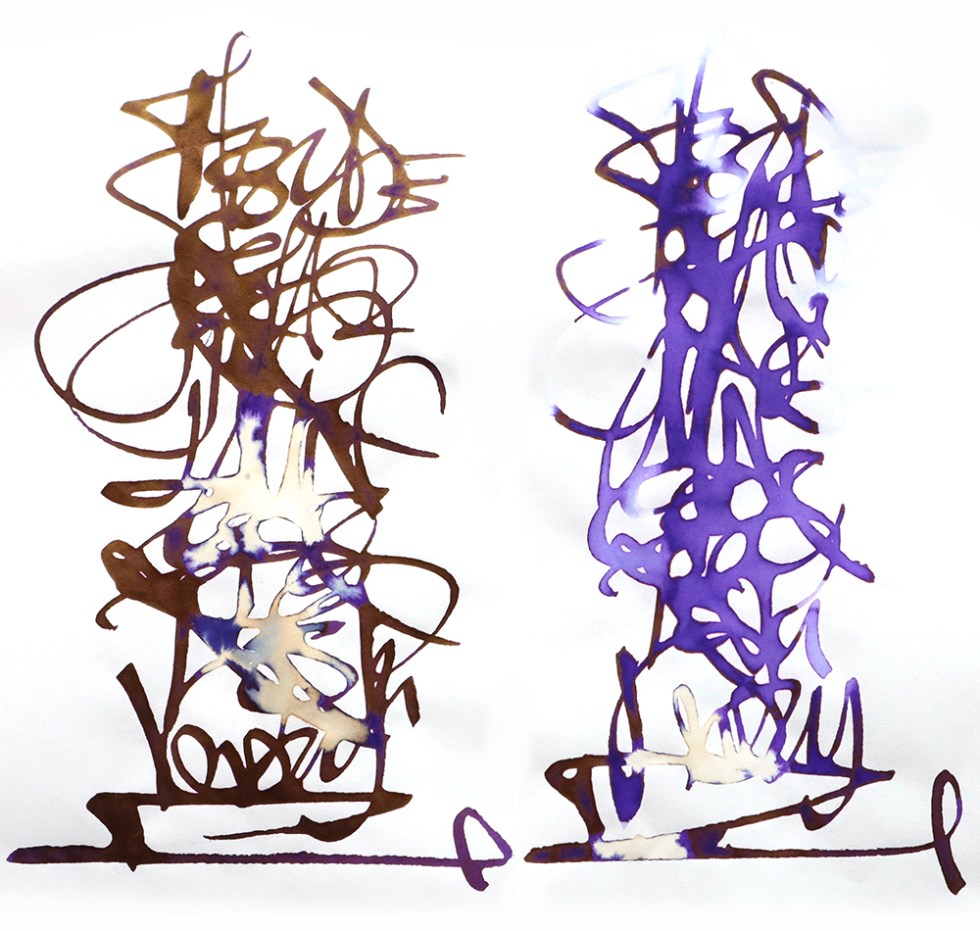 Philip on Tamoe River paper: Pure ink with a hint of bleach (left). Watered down ink with a hint of bleach (right).