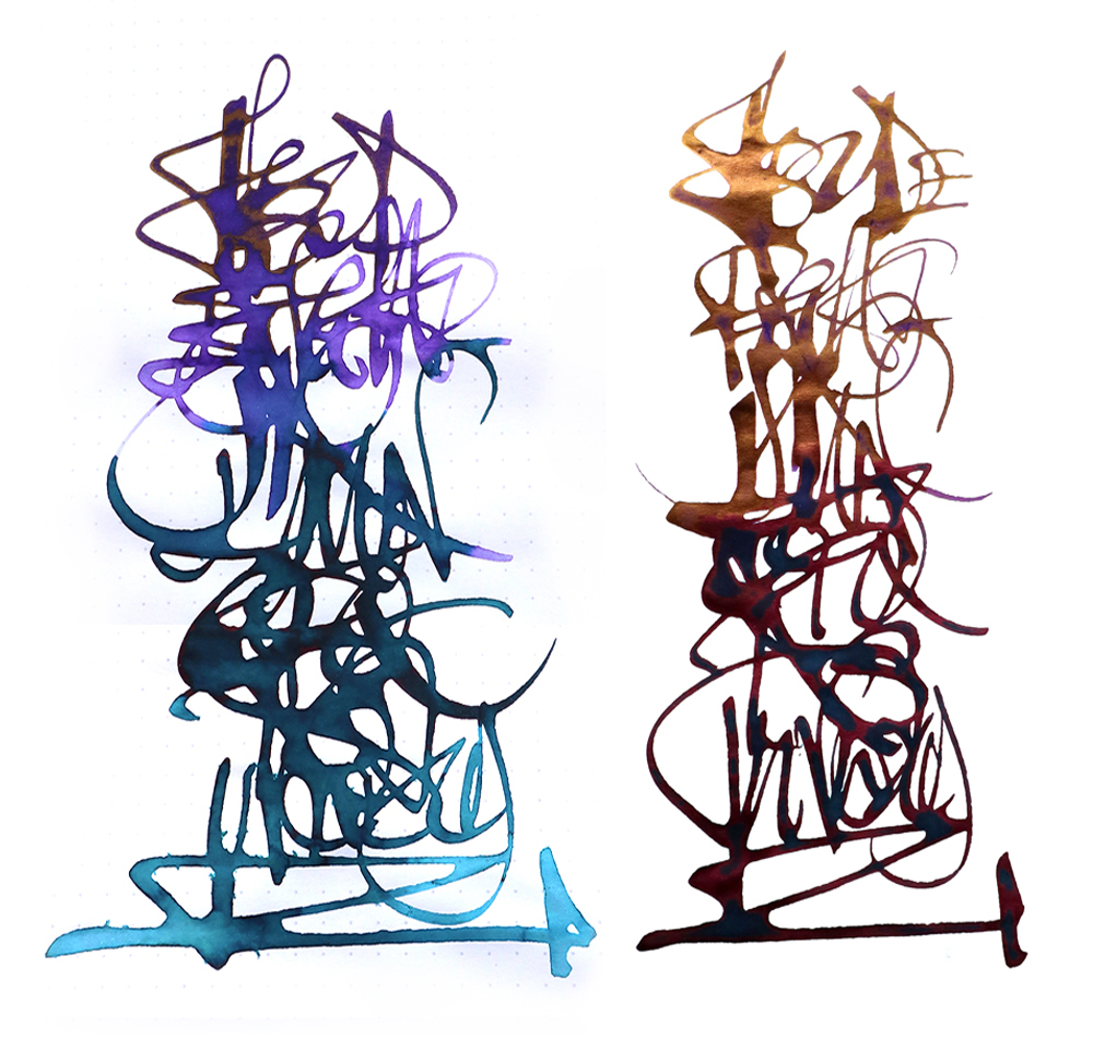 When Maureen and Robert were released in 2018 I honestly thought that here are two extreme sheen inks that won’t be bettered. Here we have a purple and deep teal, which appear to be the ‘in’ colours for 2019 but how do they fare? Philip (Purple) has no chromatic qualities and sheens a brown/gold. Christine (Teal) also shows limited chromatic qualities and sheens a deep red.