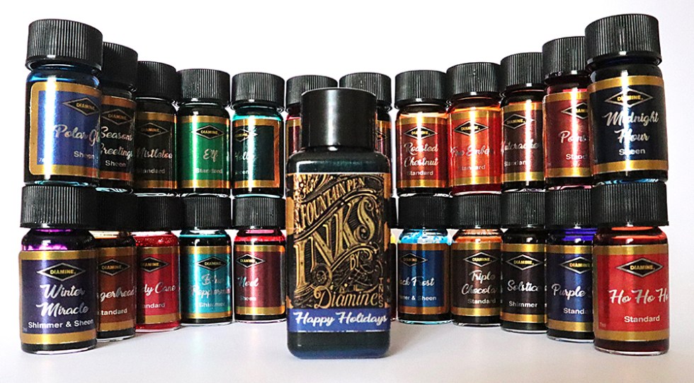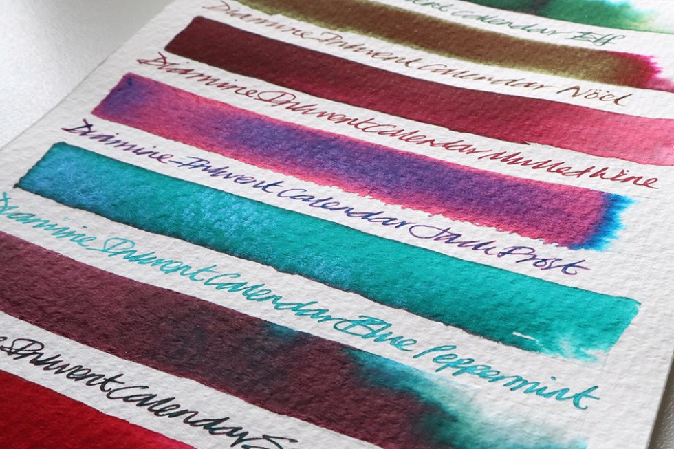 All the inks are brand new. Some are standard, while others sheen or shimmer – and some do both! Their names reflect the festive season, so once you’ve opened all your doors, you’ll have a collection of inks called: Blue Peppermint, Candy Cane, Snow Storm, Polar Glow, Triple Chocolate, Ho Ho Ho, Mistletoe, Gold Star, Nutcracker, Winter Miracle, Elf, Noel, Mulled Wine, Jack Frost, Festive Cheer, Seasons Greetings, Poinsettia, Holly, Gingerbread, Midnight Hour, Fire Embers, Solstice, Roasted Chestnut, Purple Bow & Happy Holidays.