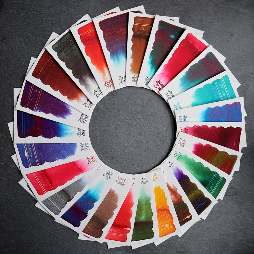 HEY! If you’re interested to know more about how to use fountain pen inks in more creative ways – whether it’s simply to observe their chromatic behaviours, or, to recreate one of my swatch cards, or, to learn how to use them in watercolour painting, illustration and calligraphy, why not check out my online course or, even better, sign up for a workshop?