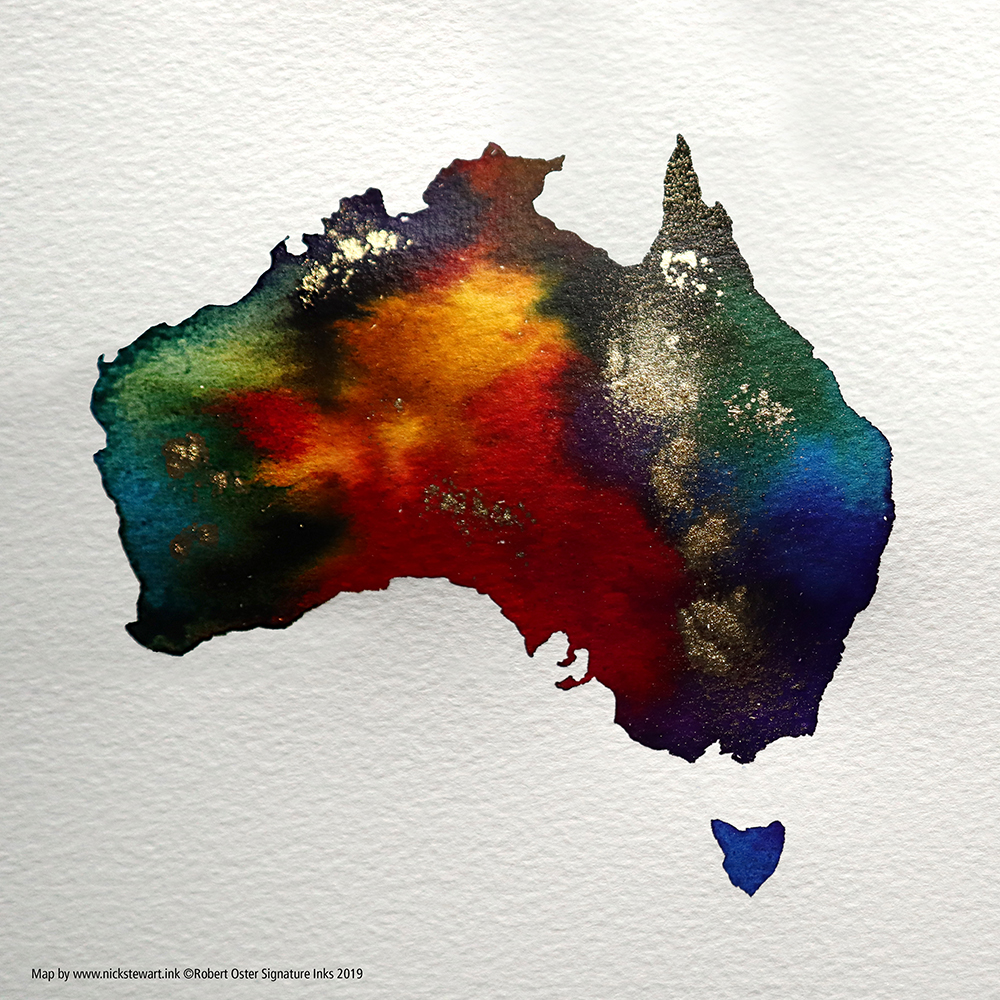A couple of months back, Robert Oster sent me some inks to sample. As he comes from Down Under it just seemed appropriate to create a map of Australia using his products. Turned out pretty good…
