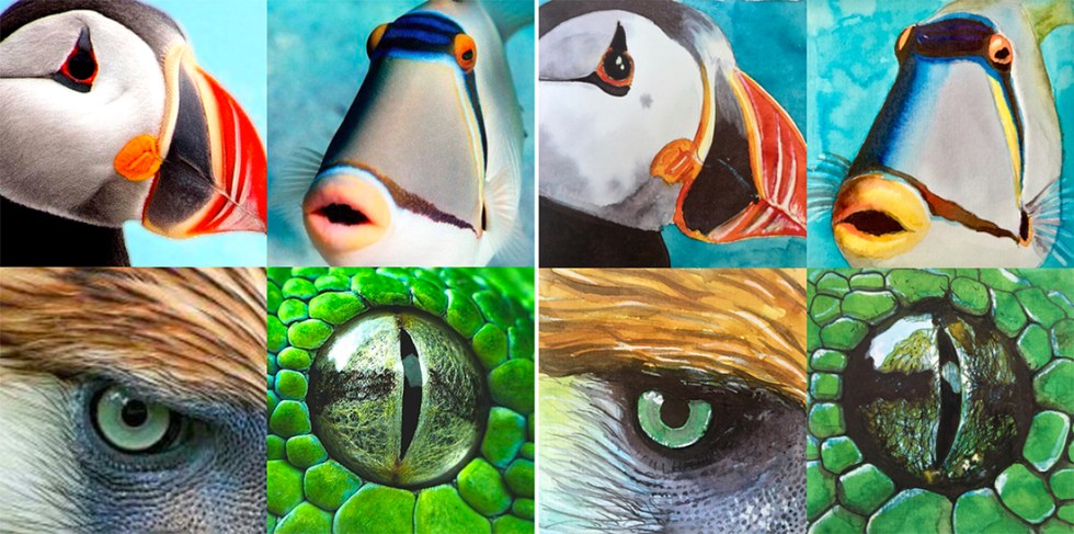 For the more detailed bits, I mixed and added the reds and oranges to the eye and beak and applied the colours using the rigger brush. Because this brush has longer hairs, it gives you more control and gives a degree of compensation for hand shaking etc.