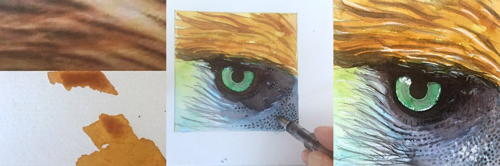 For the image crop of the eagle eye, I employed exactly the same techniques. Lighter areas first using the No.6 and more detailed features using the Rigger and fountain pen. To use the fountain pen load the rigger with colour and paint/drop the wash on top of the nib. Test and then use on the live art.