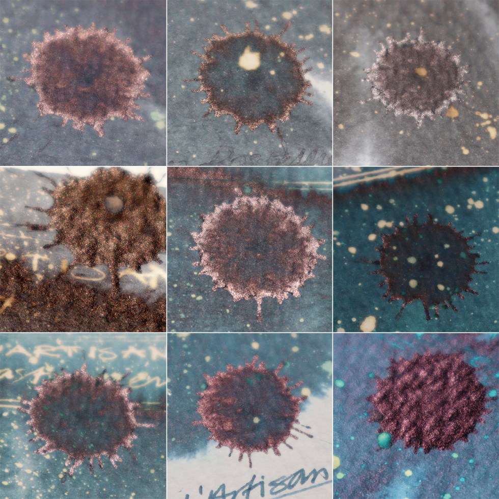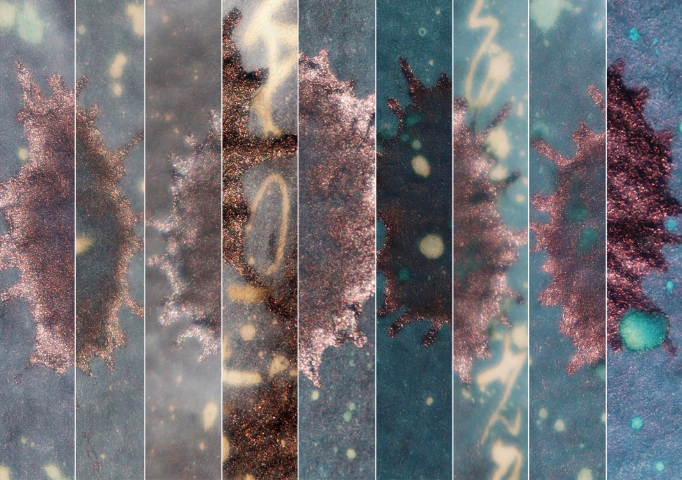 The above crops were photographed in strong sunlight at an angle. For the ink names The sequence is as per the swatch cards from left to right – top to bottom.