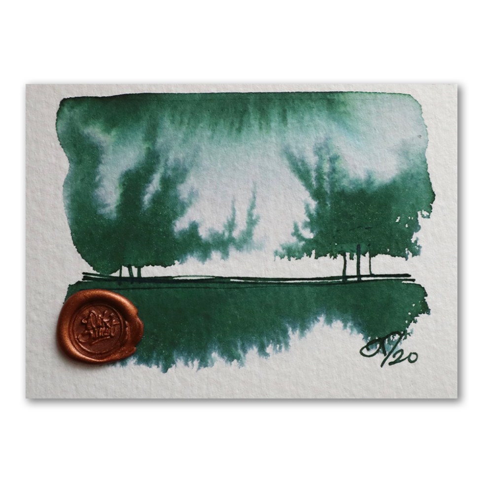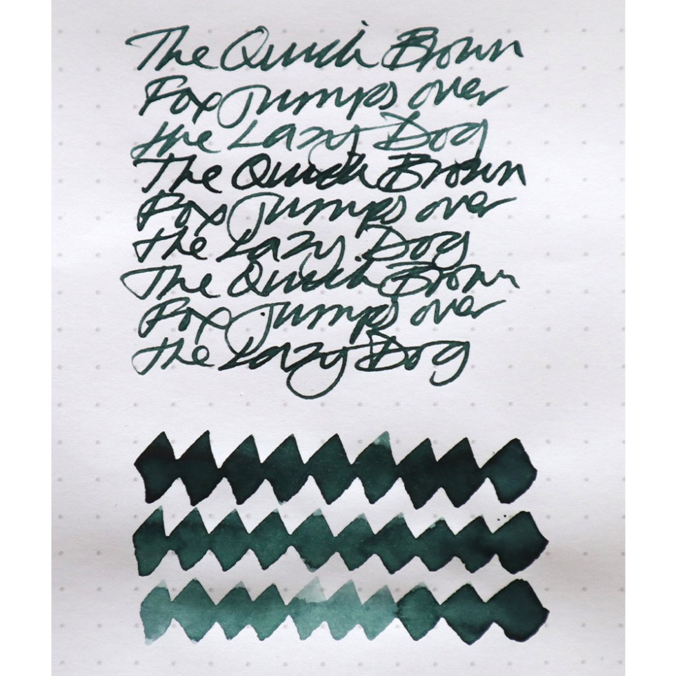 And? Great dark green colour with shading qualities aplenty. Very French and a lovely addition to their existing colour range. Even a soupson of chromatography with a delicate blue grey in evidence. Blends easily with water and reveals a great gold effect when used with bleach. Good ink flow through the nib, as you’d expect, and a real joy to write with. Of Note: The bottle I have photographed is merely a sample bottle. The actual bottle is one of the glass squares with all the trimmings.