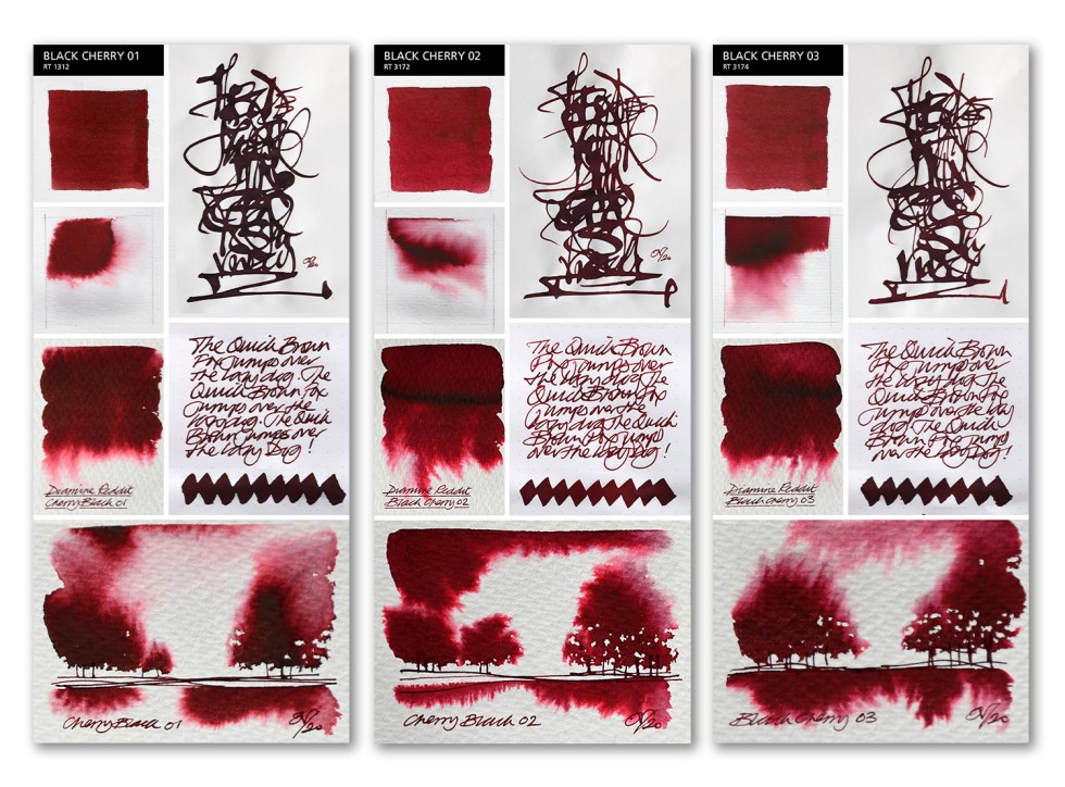 Sample 03 – when used on Tomoe River and Rhodia papers, the ink reveals shading qualities, although not as pronounced as sample 02. When swatch tested on cartridge the colour is flat and slightly lighter that sample 01 but darker than sample 02. It’s not until its chromo tested on Bockingford that we see the dark red bleed out more rubine red which is less yellow and more pink than the other 2 samples.