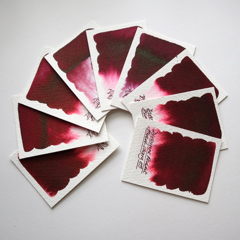 Sample 07 – when used on Tomoe River and Rhodia papers, the ink appears very dark red with shading qualities. When swatch tested on cartridge paper the colour is a flat dark cherry. It’s not until it’s chromo tested on Bockingford that we can see the dark red bleed out beautiful bright vermilion and fuchsia reds.