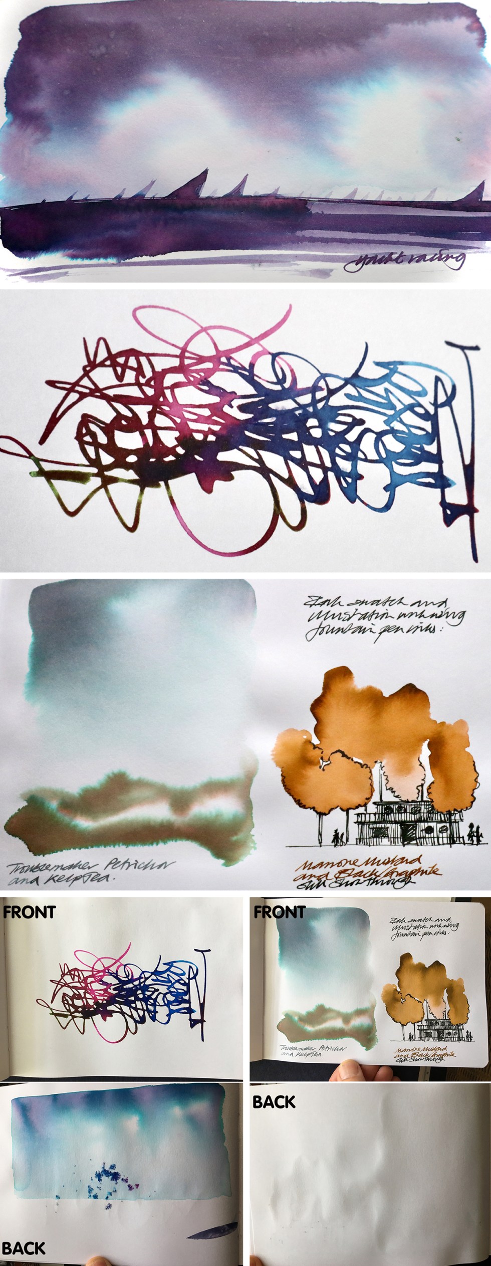 The second book I had a look at was the Rhodia Touch Bristol Book. This A5 landscape pocketbook comes in a black soft bound format blind embossed with the Rhodia Touch logo on the cover. Inside are 64 pages of 205 gsm white paper stock. First up I tried a chromo painting using Robert Oster Australian Opal Mauve. I then tried a calligraphic blend using Cult Pens Maureen and Robert. And lastly another chromo wash using Troublemaker Kelp Tea and a quick illustration using my own Twilight Black with Robert Oster Marrone Mustard. There are issues here, with ink bleed, paper ruckle, show through and bleed through. I don’t believe that this particular product can cope properly with fountain pen ink.