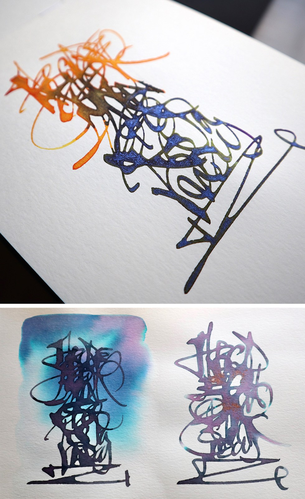 The third book I tried at was the Rhodia Touch Carbon Book. This A5 landscape book comes in a black hardbound format blind embossed with the Rhodia Touch logo on the cover. Inside are 112 pages of 120 gsm black paper stock. To be honest, I don’t think there’s much for fountain pen ink users here so I created an abstract alphabet using an automatic pen and water and then sprinkled Schmincke gold and copper dusts while wet. Whatever floats your boat!