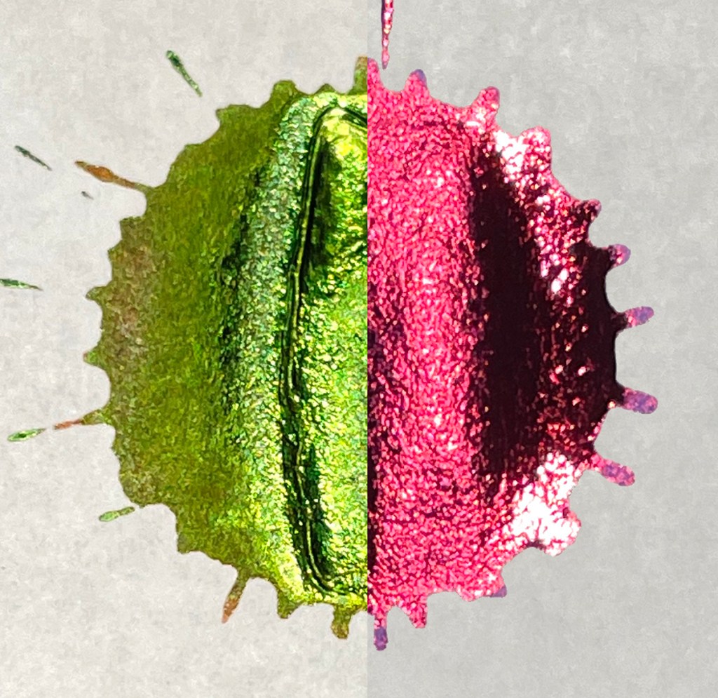 Vaikhari – A dark deep brown that bleeds out rusts and sands when added to a wetted paper surface. See below for the gorgeous subtle chromo effects. A pronounced green metallic sheen with a limited reaction to bleach, although when watered down and allowed to dry, the bleach works wonders.