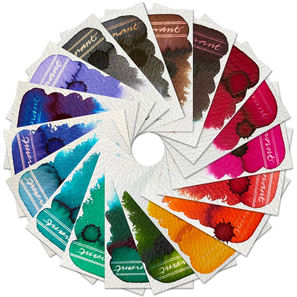 Dominant Industry Standard Inks featured: Royal Azalea, Garnet, Romania Red, Maple, Earl Grey Tea, Citrus Yellow, Leaf Green, Forest, Tsavorite, Lake, Glacier, Dominant Blue, Periwinkle Blue, Manschurian Violet, Lungo, Winter Wood, Base Black and Downpour.