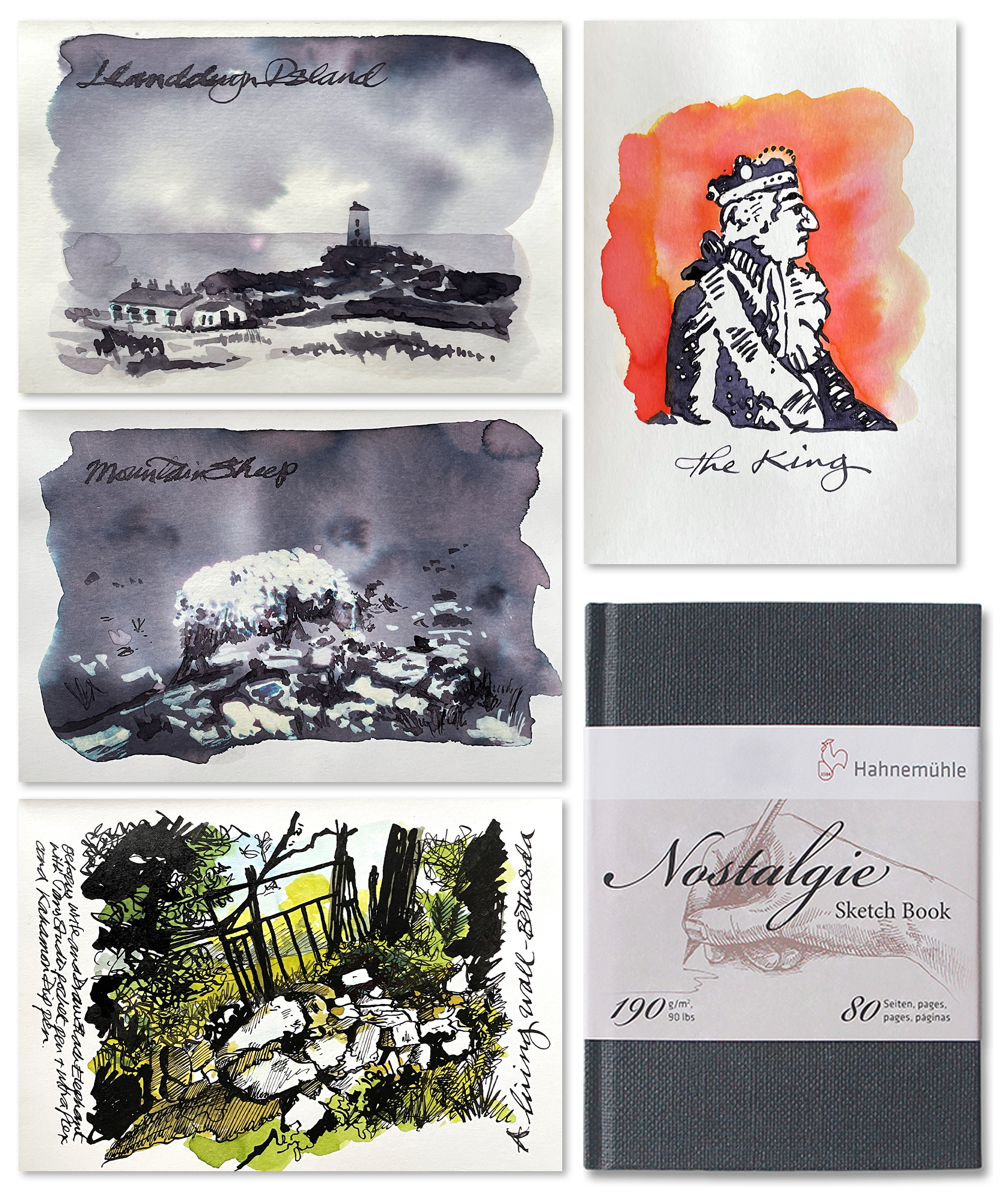 The Nostalgie Sketch book comprises a 90lb smooth finished paper which works very well with both nibs, both types of ink – pigment and dye – and bleach. The 2 swatch paintings using Nick Stewart Twilight Black and bleach each gave great chromo although I did note a little bleed when using the flexnib to write on top of the swatch backgrounds – this could be the flexnib? The two pigmented inks used for The King and the Wall Gate scene were easy to apply and dried fairly quickly. The standard dye based ink overlays and fills are vibrant with no smudging. The Nostalgie is most definitely recommended for fountain pen ink art.