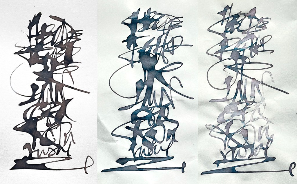 Bijih Timah, which means tin ore in Malay, is supposedly a grey ink, but appears markedly different depending on what paper surface you choose to use. On Tomoe River paper (middle and right abstract calligraphy examples) and in a Cult Pens swatch sample book (above), the colour is a definite blue grey and then when applied with water, the tiniest hint of brown can be detected too.