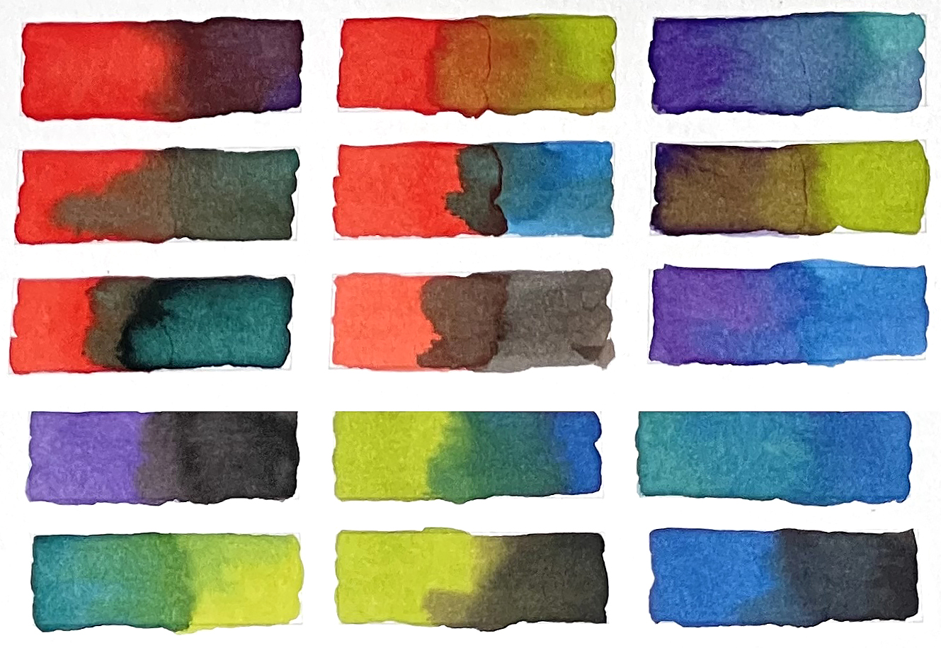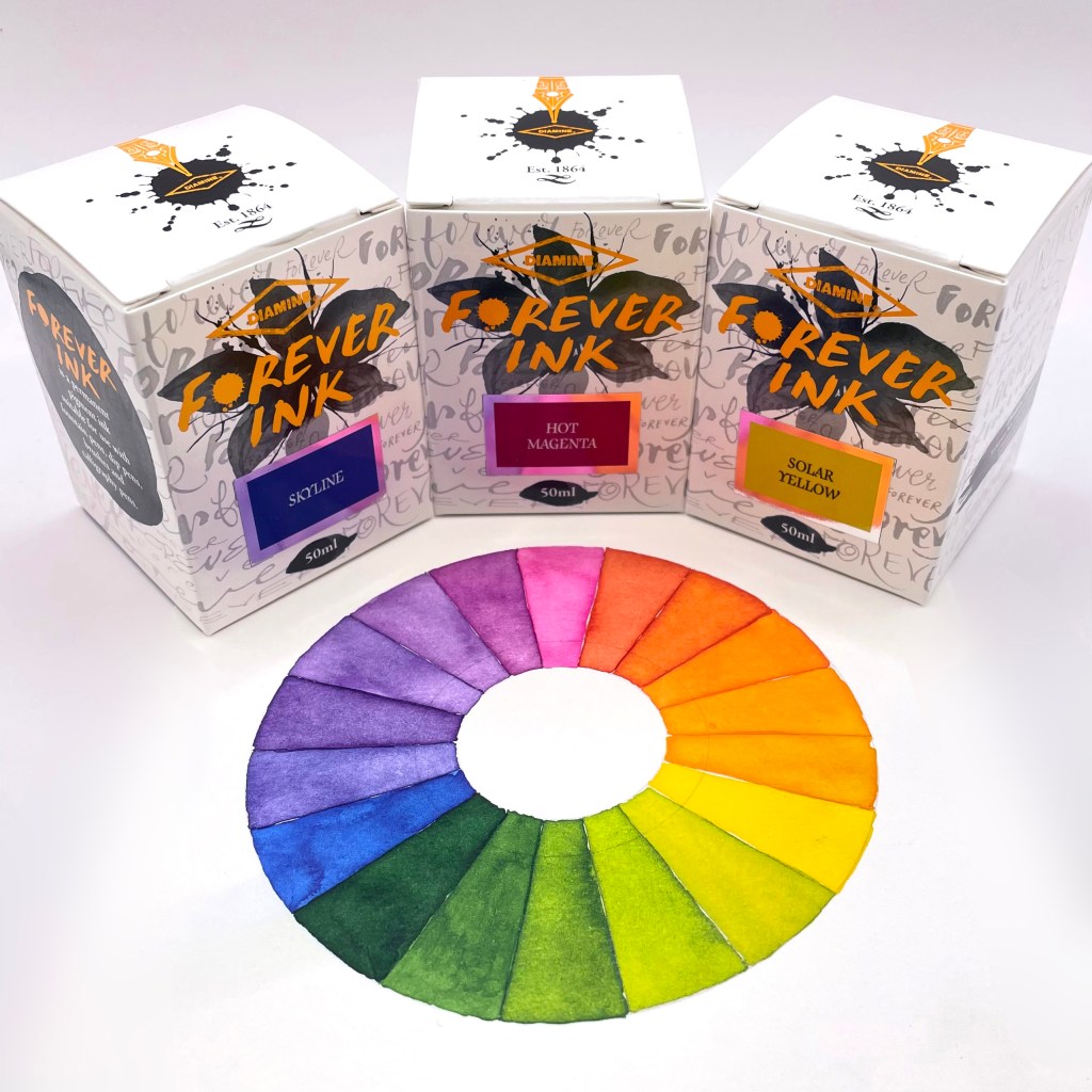 The last four inks I have enlarged as they are in effect CMYK primary colours. And they mix together beautifully. So if you are planning on just getting a few bottles, do consider these because you can then mix your own secondary colours with them. Check out the colour wheel below to prove my point.