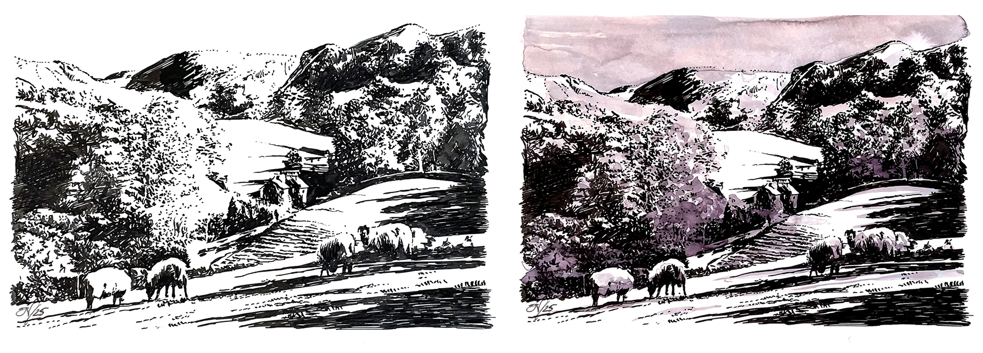 And you can use these in many different ways. If I choose, I can illustrate with a fountain pen* and then paint tonal washes using the other Forever Ink colours. (See above). But I can also illustrate with the Forever Inks and overpaint with dye base inks. Because the Forever ink is permanent, it acts like a resist. So I can overpaint with dye base inks and still get the benefits of chromatography and using bleach! (See below). And click here to see how I used them to record my trip around the Outer Hebrides.