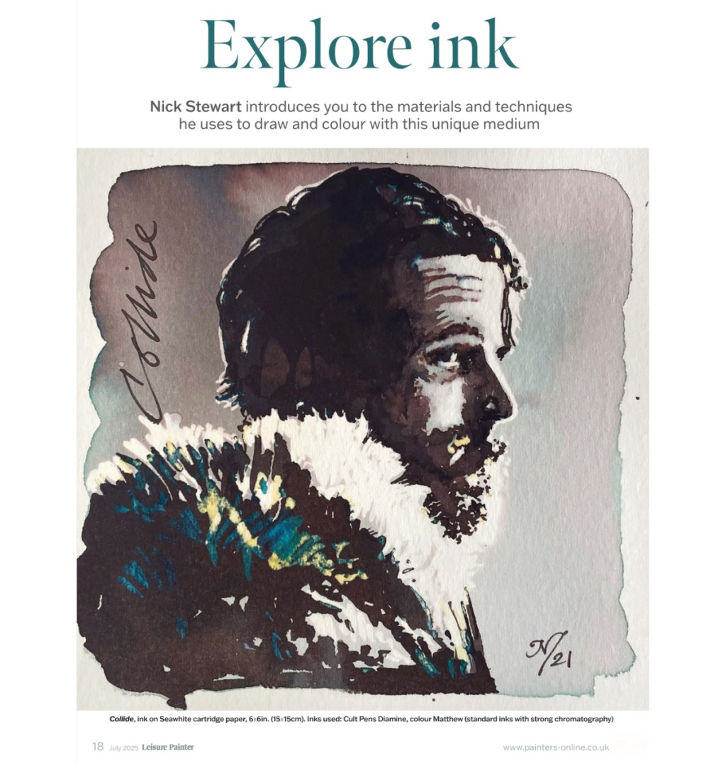 Leisure Painter Magazine have very kindly featured me in one of their recent issues. It’s a very brief introduction to fountain pen ink art followed by a simple(ish) tutorial utilising the chromatic qualities of Robert Oster Opal Mauve – every little mention furthers the cause. Enjoy!