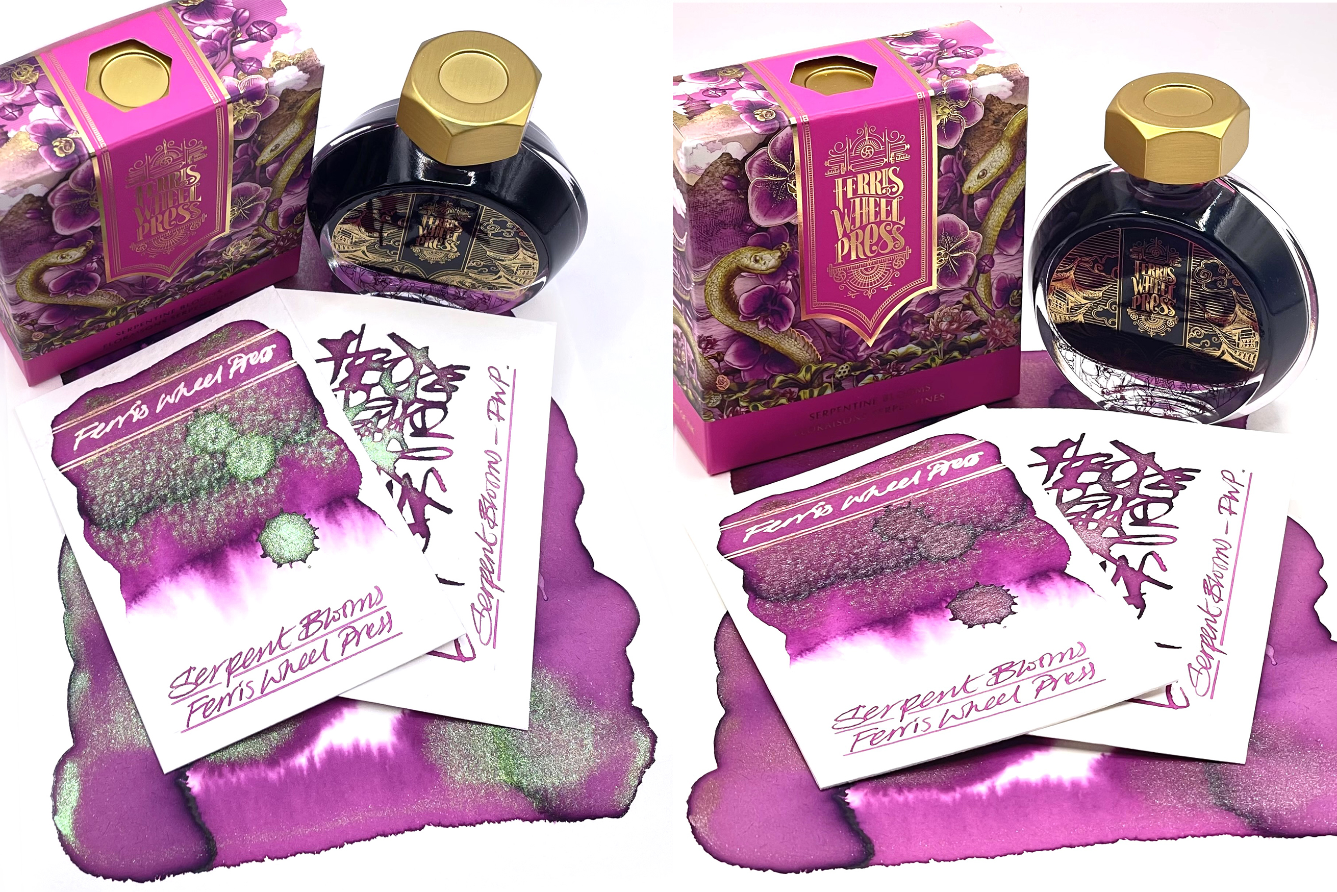 Serpent Blooms is a voluptuous orchid pink ink with a stunning duotone pink/green shimmer and is a Year of the Snake special edition. No chromatic effects in evidence but it does have a compelling neon white reaction with bleach.