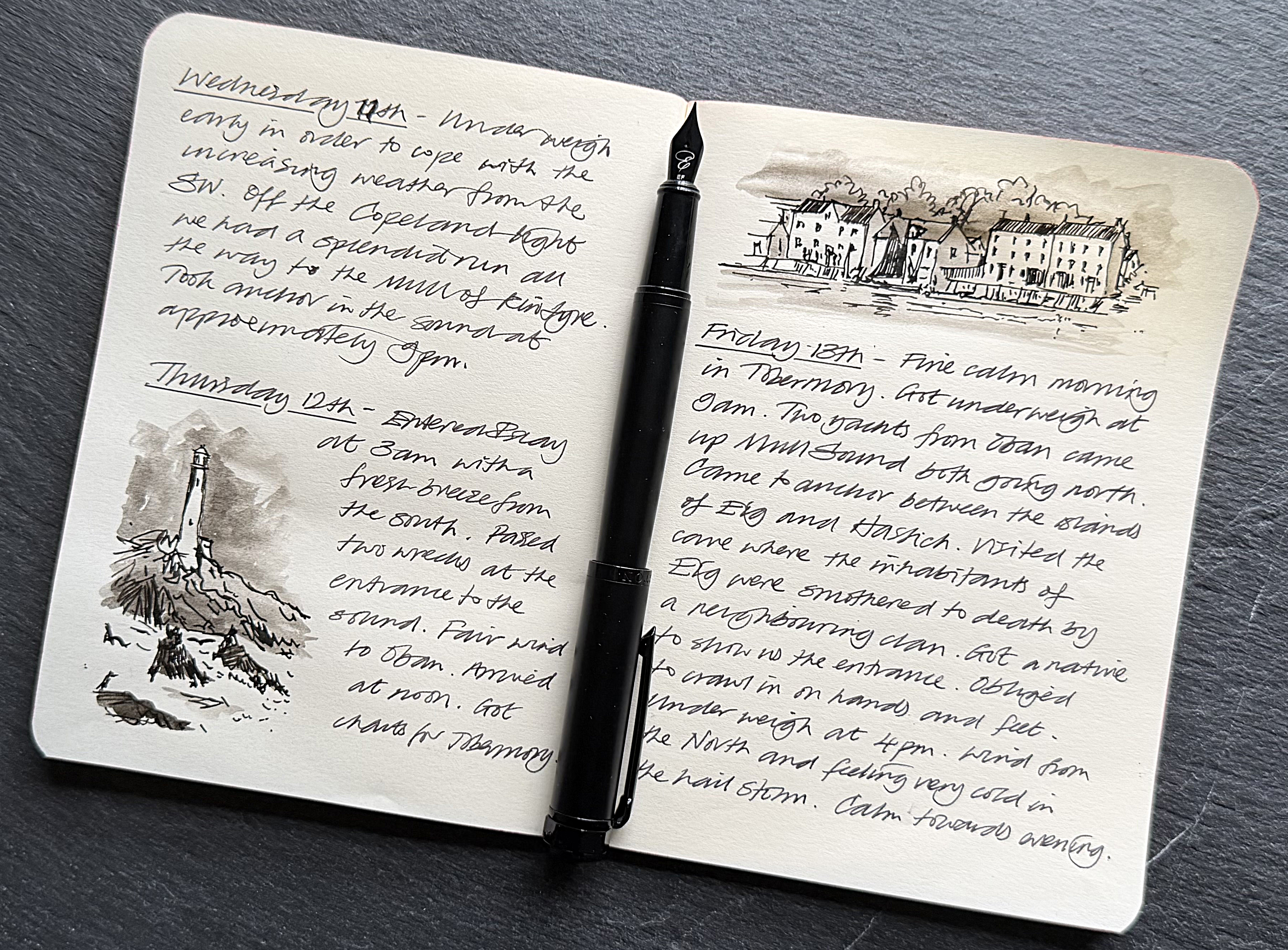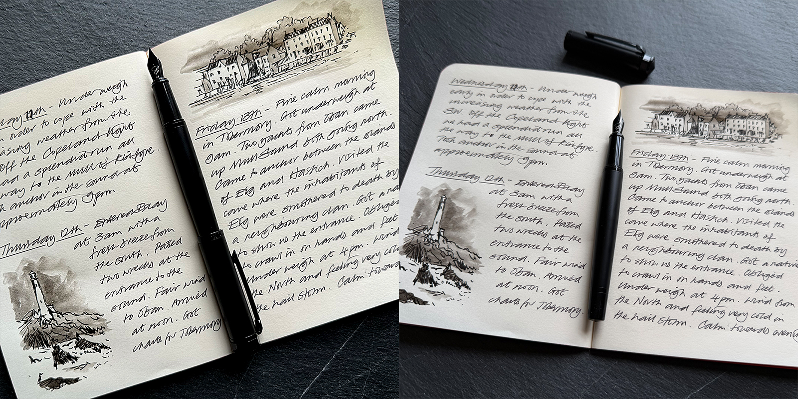 And for the illustrations? I had asked for an extra fine nib for this very purpose. And I think it did the job rather well. I added the half tones with a watercolour brush. And crucially, the handwriting and illustrations are safe from any sea spray!