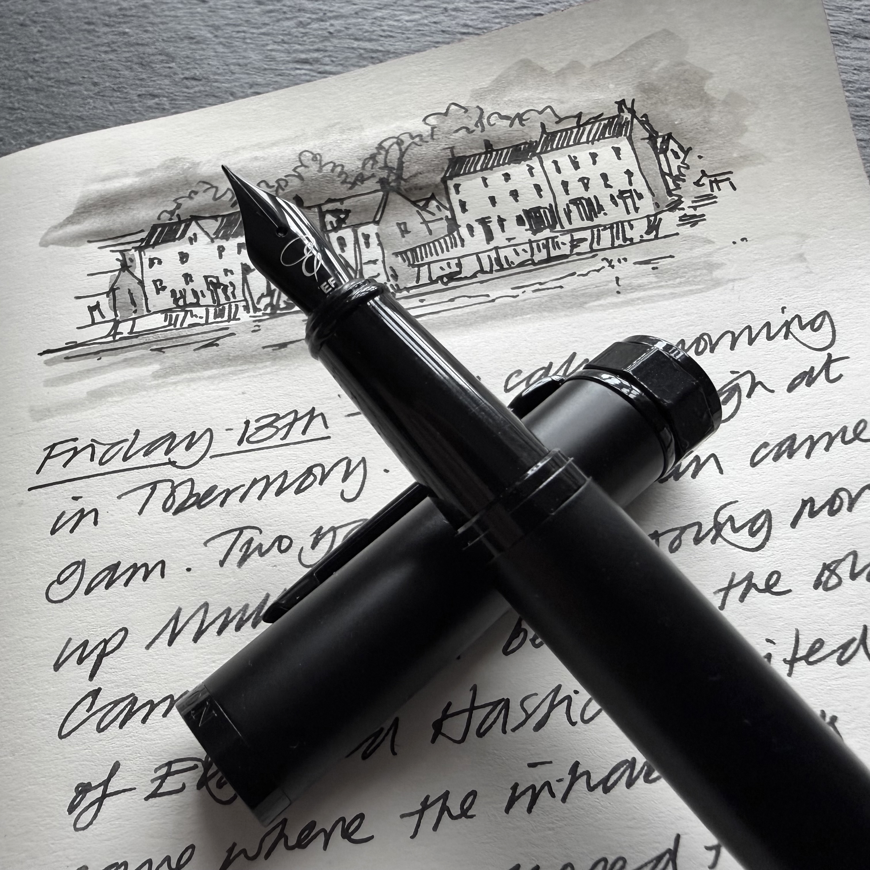 I liked the look of it immediately. Sleek and understated The Stealth is tastefully finished in matte black with gloss black detailing. The gloss black nib features a single light grey copperplate script letter E. And, crucially for me, when held, it felt warm and comfortable – steel barrels can often feel cold. And the no nonsense cap simply slides and clicks securely to the barrel.
