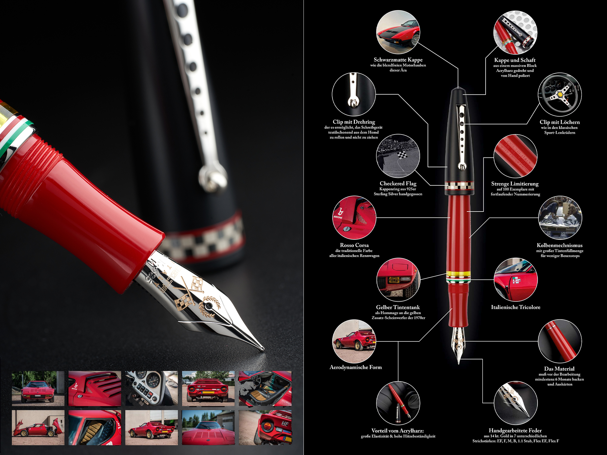 The Italian Rally Passion fountain pen has been put together by the Neapolitan company Delta Pens, who specialise in limited edition top quality writing instruments and the finish is just eye popping! Referencing the image above, you can see that Stephan has created a pen that pays homage to the styling of the legendary Lancia Stratos in amazing detail.