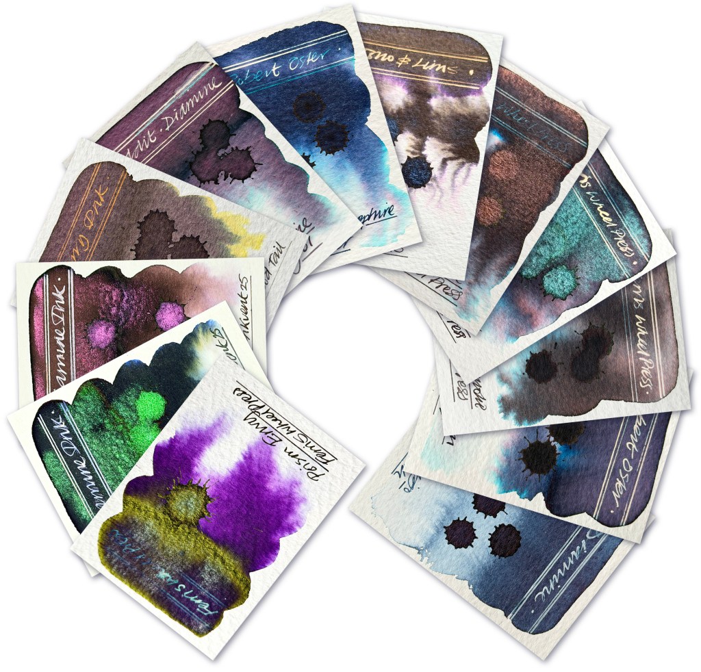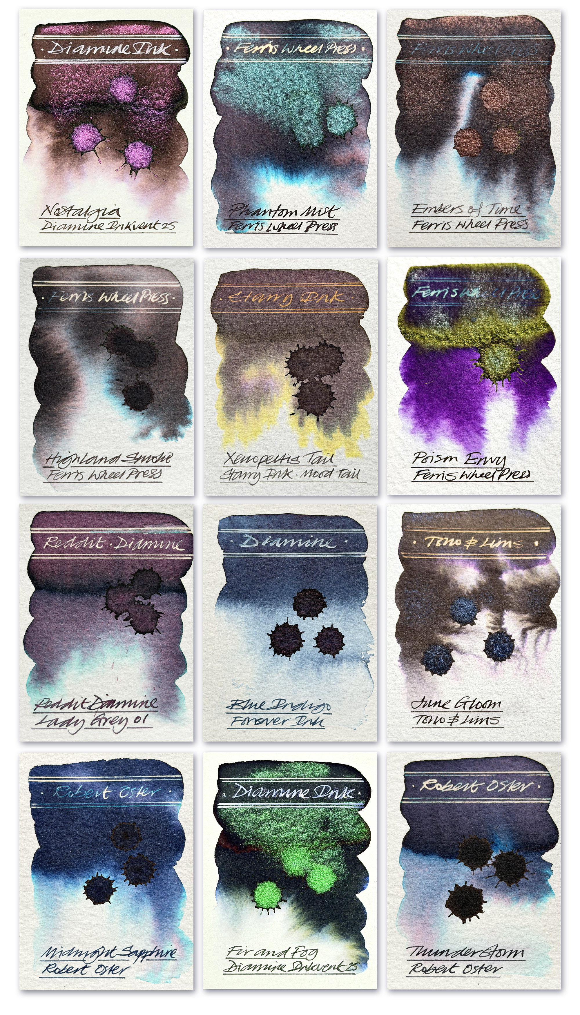 And so for my top 12 inks of 2025 – a good range of standard and shimmer fountain pen inks with a bias towards chromatography except for the one nano pigment ink, all perfect for creating fountain pen ink art: