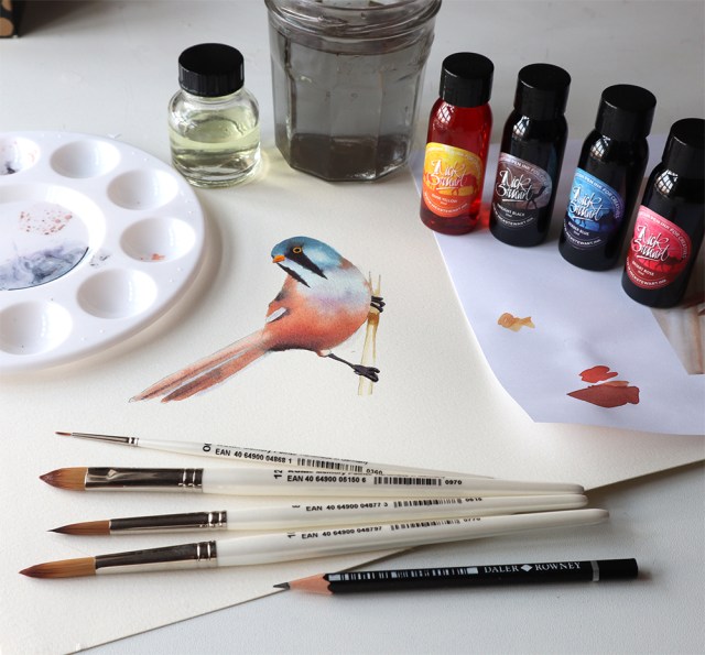 Mixed fountain pen inks onto Saunders watercolour paper. I used KUM Memory Point brushes for the first time. I always use synthetic brushes and for the money thought these worked well.