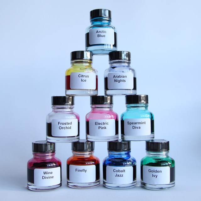 EXCLUSIVE! Straight from the factory! The 10 brand new Diamine Shimmer Inks! For us to test at this Saturday’s workshop! 5 places left! Come along. Details below: