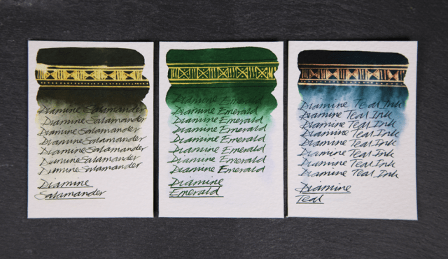 Diamine Salamander, Emerald and Teal – All three of these inks behave in a similar way. They bleed easily when added to water with a mottled sediment at the breakdown of the wash suggesting more colour pigmentation in solution. All three […]
